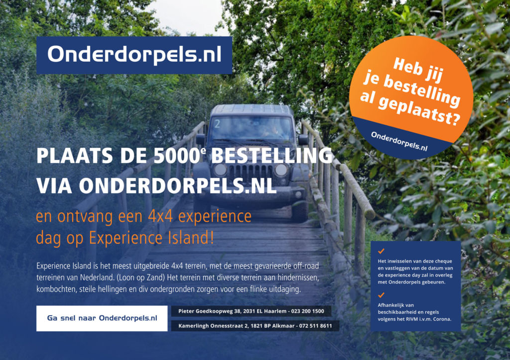 Plaats de 5000e bestelling via Onderdorpels.nl en ontvang een 4×4 experience dag op Experience Island!